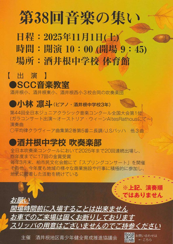 酒井根青少協行事部によるイベント「第38回 音楽の集い」の開催案内プリントです。